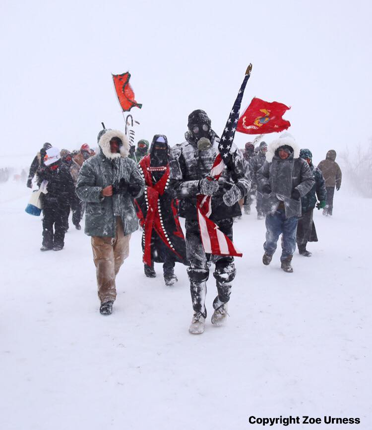 The photograph captures a moment on the frigid, snowy day when veterans arrived to join the water protectors.