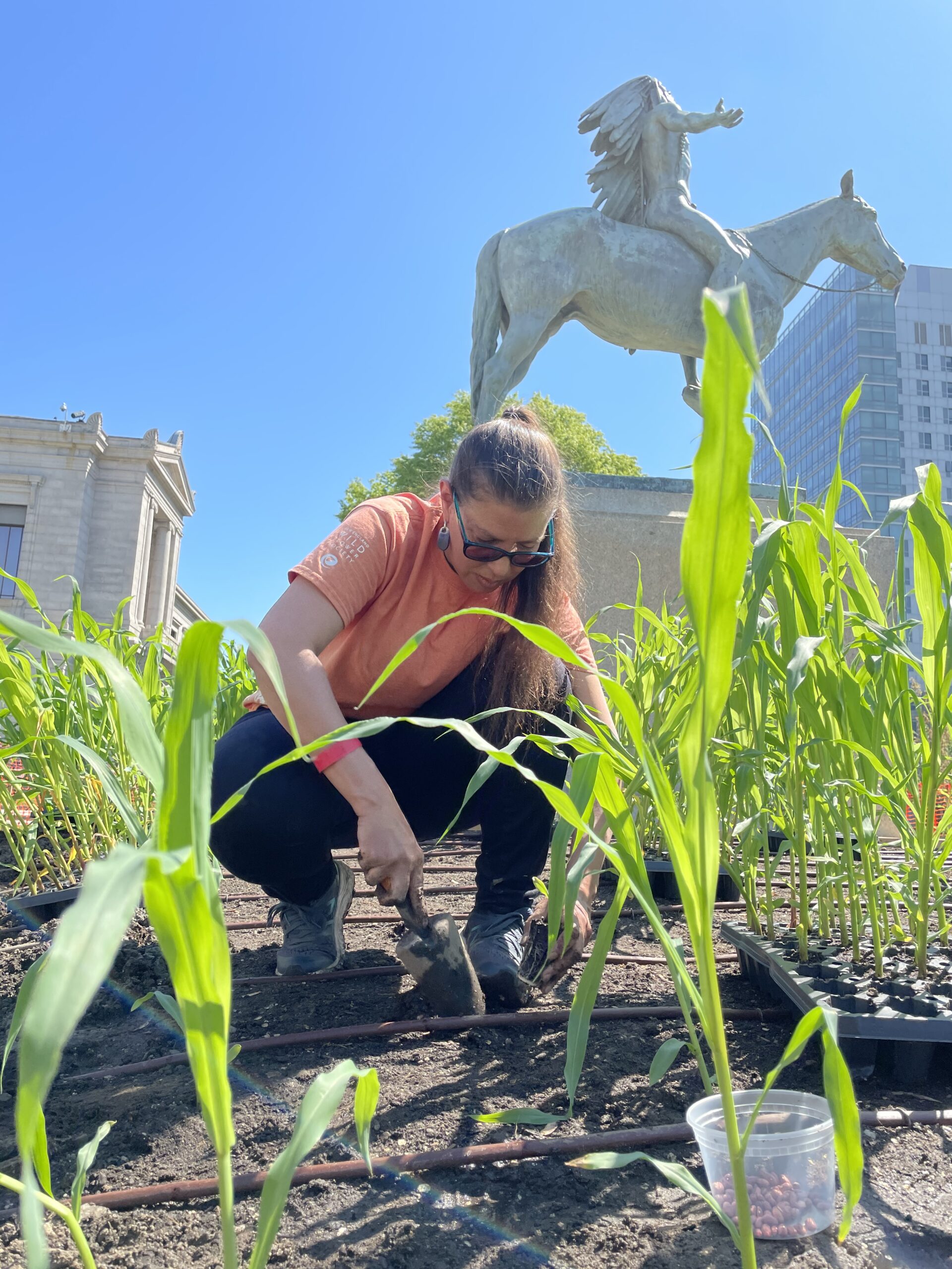 In Raven Reshapes Boston: A Native Corn Garden at the MFA, James-Perry will use Indigenous planting techniques to transform the grass around the Cyrus Dallin sculpture, which represents an invented Native man, into a field of corn and other plants surrounded by shells.